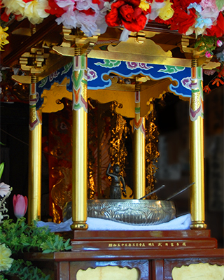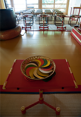 誕生仏の像をその中央に安置し、柄杓で像に甘茶をかけて祝います。