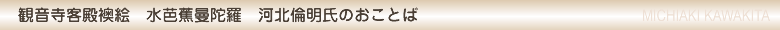 今回完成した観音寺客殿の襖絵36面は、左のような経過の中で数年がかりでまとまったものだけに、作者の仕事の意義を十分に味わせ手くれる記念的な代表作となっている。それはいわゆる仏画ではないが、まさに高い意味のユニイクな仏画である。また一見抽象画ともみえるが、そこにはつよく美しい水芭蕉のリアリティが裏づいている。さらに日本画であり墨絵でありながら、それらの通念を越える高邁な表現となっているところが見どころであろう。このような注目すべき健康で異色の芸術が、ここに見事に成就したことを、皆さんと共に喜ばずにはいられない。 |